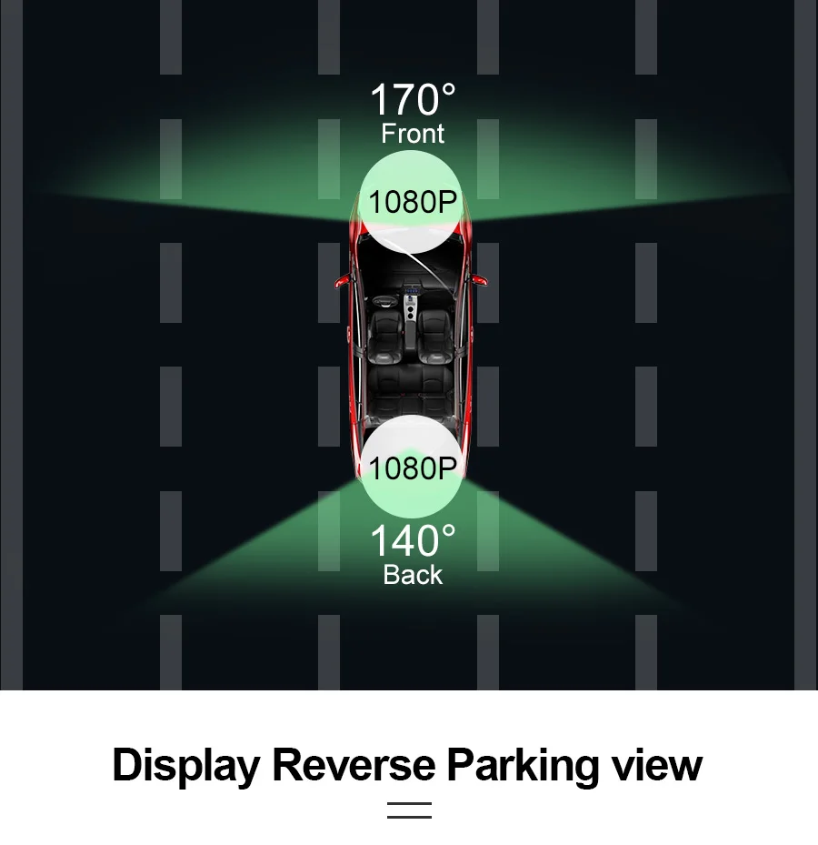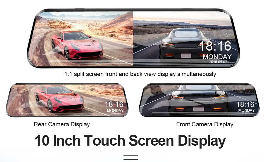 1:1 split screen design to switch front and rearview recording, big screen and clearly and ersily to check rear view.Touch screen to switch to front camera,back camera.